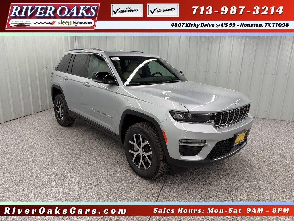 Let the team at River Oaks CDJR introduce you to an entirely new kind of car-buying experience. If you're looking for a deal, this is it. This vehicle is priced below market for immediate sale. No add-ons. No Surprises. Just honest deals. Sin cargos ocultos. Sin sopresas. Solo ofertas honestas. No Pague Mas. Hablamos Espanol! This 2025 Jeep Grand Cherokee Limited in Silver Zynith comes with the following features: 3.6L V6 24V VVT 8-Speed Automatic RWD Quick Order Package 22E, 4-Wheel Disc Brakes, 6 Speakers, ABS brakes, Active Noise Control System, Air Conditioning, Alloy wheels, AM/FM radio: SiriusXM with 360L, Anti-whiplash front head restraints, Audio memory, Auto High-beam Headlights, Automatic temperature control, Brake assist, Bumpers: body-color, Capri Leatherette Seats, Compass, Delay-off headlights, Driver door bin, Driver vanity mirror, Dual front impact airbags, Dual front side impact airbags, Electronic Stability Control, Emergency communication system, Four wheel independent suspension, Front anti-roll bar, Front Bucket Seats, Front Center Armrest w/Storage, Front dual zone A/C, Front fog lights, Front License Plate Bracket, Front reading lights, Fully automatic headlights, Garage door transmitter, Heated door mirrors, Heated front seats, Heated rear seats, Heated steering wheel, Illuminated entry, Knee airbag, Low tire pressure warning, Memory seat, Model Year Tracking, Navigation System, Normal Duty Suspension, Occupant sensing airbag, Outside temperature display, Overhead airbag, Overhead console, Panic alarm, ParkView Rear Back-Up Camera, Passenger door bin, Passenger vanity mirror, Power door mirrors, Power driver seat, Power Liftgate, Power passenger seat, Power steering, Power windows, Radio data system, Radio: Uconnect 5 Nav with 10.1" Display, Rear anti-roll bar, Rear reading lights, Rear window defroster, Rear window wiper, Remote keyless entry, Security system, Speed control, Speed-Sensitive Wipers, Split folding rear seat, Spoiler, Steering wheel mounted audio controls, Tachometer, Telescoping steering wheel, Tilt steering wheel, Traction control, Trip computer, Turn signal indicator mirrors, Variably intermittent wipers, Voltmeter, and Wheels: 18" x 8" Polished/Painted Aluminum.