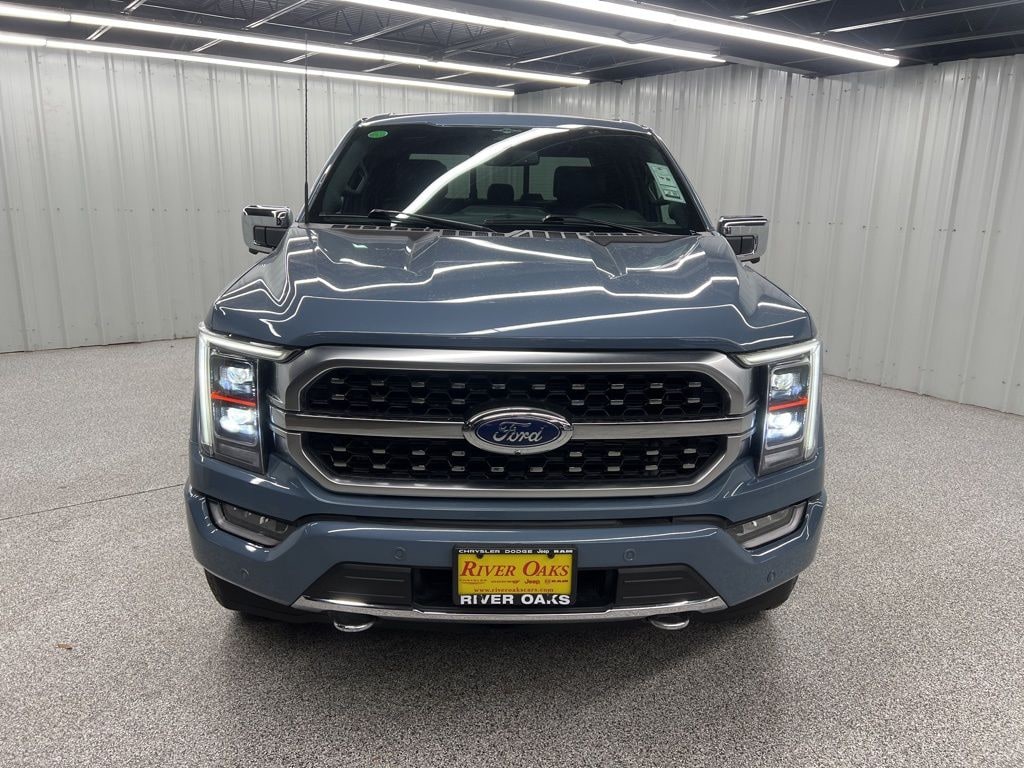This 2023 Ford F-150 Platinum in Azure Gray Metallic Tri-Coat comes with the following features: 3.5L PowerBoost Full-Hybrid V6 10-Speed Automatic 4WD 3.5L PowerBoost Full-Hybrid V6 and 4WD Bed Utility Package (BoxLink, LED Box Lighting, Power Tailgate, and Tailgate Step w/Tailgate Work Surface), Equipment Group 701A High (360 Degree Camera, Pro Trailer Backup Assist & Pro Trailer Hitch Assist, and Radio: B&O Unleashed Sound System by Bang & Olufsen), Ford BlueCruise 1.0 (Active Park Assist 2.0), FX4 Off-Road Package (4x4 FX4 Off-Road Bodyside Decal, Hill Descent Control, Monotube Rear Shocks, Off-Road Tuned Front Shock Absorbers, Rock Crawl Mode, and Tray Style Floor Liner), Trailer Tow Package (Class IV Trailer Hitch Receiver and Integrated Trailer Brake Controller), 3.5L PowerBoost Full-Hybrid V6, 4WD, 20" Polished Aluminum Wheels, 4-Wheel Disc Brakes, 8 Speakers, ABS brakes, Active Park Assist 2.0 Removal, Adjustable pedals, Air Conditioning, Alloy wheels, AM/FM radio: SiriusXM with 360L, Ash Cup w/Lighter, Auto High-beam Headlights, Auto Start-Stop Removal (DISC), Auto tilt-away steering wheel, Auto-dimming door mirrors, Auto-dimming Rear-View mirror, Automatic temperature control, Brake assist, Bumpers: body-color, Compass, Delay-off headlights, Driver door bin, Driver vanity mirror, Dual front impact airbags, Dual front side impact airbags, Electronic Stability Control, Emergency communication system: SYNC 4 911 Assist, Exterior Parking Camera Rear, First Aid Kit w/Ford Logo, Front anti-roll bar, Front Bucket Seats, Front Center Armrest, Front dual zone A/C, Front fog lights, Front reading lights, Front wheel independent suspension, Fully automatic headlights, Garage door transmitter, Heated door mirrors, Heated front seats, Heated rear seats, Heated steering wheel, Illuminated entry, Inclination/Intrusion Sensor Removal, Interior Work Surface, LED Sideview Mirror Spotlights, Low tire pressure warning, Memory seat, Multicontour Seats w/Active Motion Removal, Occupant sensing airbag, Outside temperature display, Overhead airbag, Overhead console, Panic alarm, Passenger door bin, Passenger vanity mirror, Pedal memory, Power door mirrors, Power driver seat, Power passenger seat, Power steering, Power windows, Pro Power Onboard - 7.2KW, Radio data system, Radio: B&O Sound System by Bang & Olufsen, Rain sensing wipers, Rear reading lights, Rear seat center armrest, Rear step bumper, Rear window defroster, Remote keyless entry, Security system, Speed control, Speed-sensing steering, Split folding rear seat, Steering Wheel Heat Removal (DISC), Steering wheel memory, Steering wheel mounted audio controls, SYNC 4 w/Enhanced Voice Recognition, Tachometer, Telescoping steering wheel, Tilt steering wheel, Traction control, Trip computer, Turn signal indicator mirrors, Twin Panel Moonroof, Unique Multi-Contour Leather Bucket Seats, Variably intermittent wipers, Ventilated front seats, and Voltmeter.