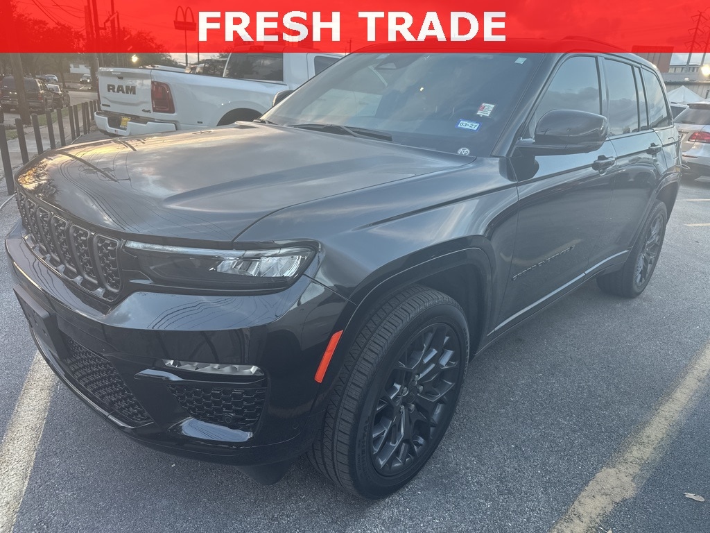 This 2025 Jeep Grand Cherokee Summit in Diamond Black Crystal Pearlcoat comes with the following features: 3.6L V6 24V VVT 8-Speed Automatic 4WD 4WD High Altitude Package (Gloss Black Exterior Accents, Neutral Gray Exterior Accents, Painted Door Cladding, and Wheels: 21" x 9" Black Painted Aluminum), Quick Order Package 23S, 4WD, 10 Speakers, 4-Wheel Disc Brakes, ABS brakes, Active Noise Control System, Adaptive suspension, Air Conditioning, Alloy wheels, AM/FM radio: SiriusXM with 360L, Anti-whiplash front head restraints, Audio memory, Auto High-beam Headlights, Auto-dimming door mirrors, Auto-dimming Rear-View mirror, Auto-leveling suspension, Automatic temperature control, Auxiliary Battery, Brake assist, Bumpers: body-color, Compass, Delay-off headlights, Driver door bin, Driver vanity mirror, Dual front impact airbags, Dual front side impact airbags, Electronic Stability Control, Emergency communication system, Four wheel independent suspension, Front anti-roll bar, Front Bucket Seats, Front Center Armrest w/Storage, Front dual zone A/C, Front fog lights, Front License Plate Bracket, Front reading lights, Fully automatic headlights, Garage door transmitter, Genuine wood dashboard insert, Genuine wood door panel insert, Heated door mirrors, Heated front seats, Heated rear seats, Heated steering wheel, Illuminated entry, Knee airbag, Leather steering wheel, Low tire pressure warning, Memory seat, Model Year Tracking, Nappa Leather Seats, Navigation System, Normal Duty Suspension, Occupant sensing airbag, Outside temperature display, Overhead airbag, Overhead console, Panic alarm, Passenger door bin, Passenger vanity mirror, Power door mirrors, Power driver seat, Power Liftgate, Power moonroof, Power passenger seat, Power steering, Power windows, Radio data system, Radio: Uconnect 5 Nav w/10.1" Display, Rain sensing wipers, Rear air conditioning, Rear anti-roll bar, Rear dual zone A/C, Rear reading lights, Rear seat center armrest, Rear window defroster, Rear window wiper, Remote keyless entry, Security system, Speed control, Speed-Sensitive Wipers, Split folding rear seat, Spoiler, Steering wheel memory, Steering wheel mounted audio controls, Tachometer, Telescoping steering wheel, Tilt steering wheel, Traction control, Trip computer, Turn signal indicator mirrors, Variably intermittent wipers, Ventilated front seats, Voltmeter, and Wheels: 20" x 8.5" Fully Painted Aluminum Silver.